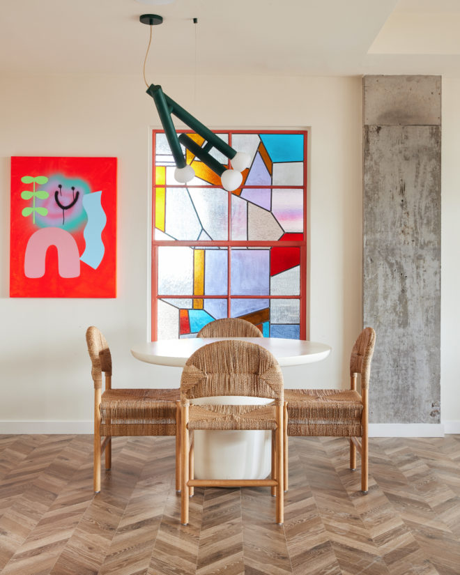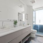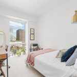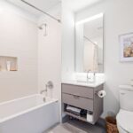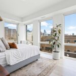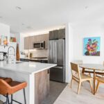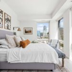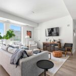 This two-bedroom at Swift & Co. features an open layout with floor-to-ceiling windows that fill the home with natural light. Cove lighting enhances the living space, creating a warm and inviting atmosphere. The kitchen is designed with dual-tone cabinetry and stainless steel appliances, blending modern style with everyday functionality. Custom closet systems in the bedrooms provide thoughtful storage, while the bathrooms are finished with clean, modern details.