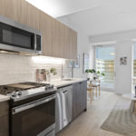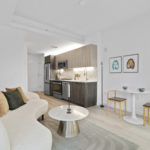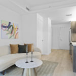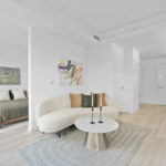This studio at Swift & Co. features a unique alcove layout that creates a natural separation between living and sleeping areas. Floor-to-ceiling windows bring in abundant natural light, complemented by cove lighting for a refined touch. The kitchen includes dual-tone cabinetry and stainless steel appliances, while ample closet space provides practical storage.